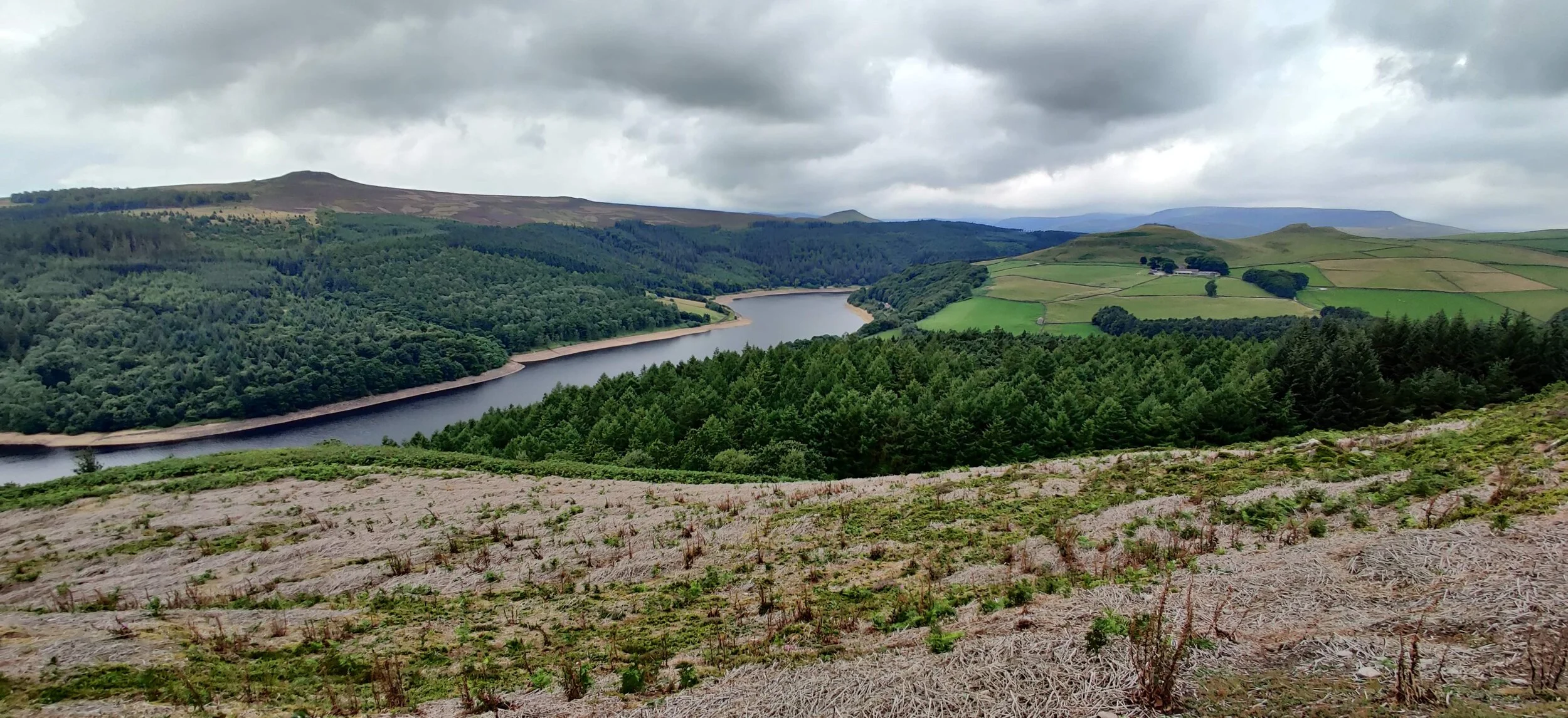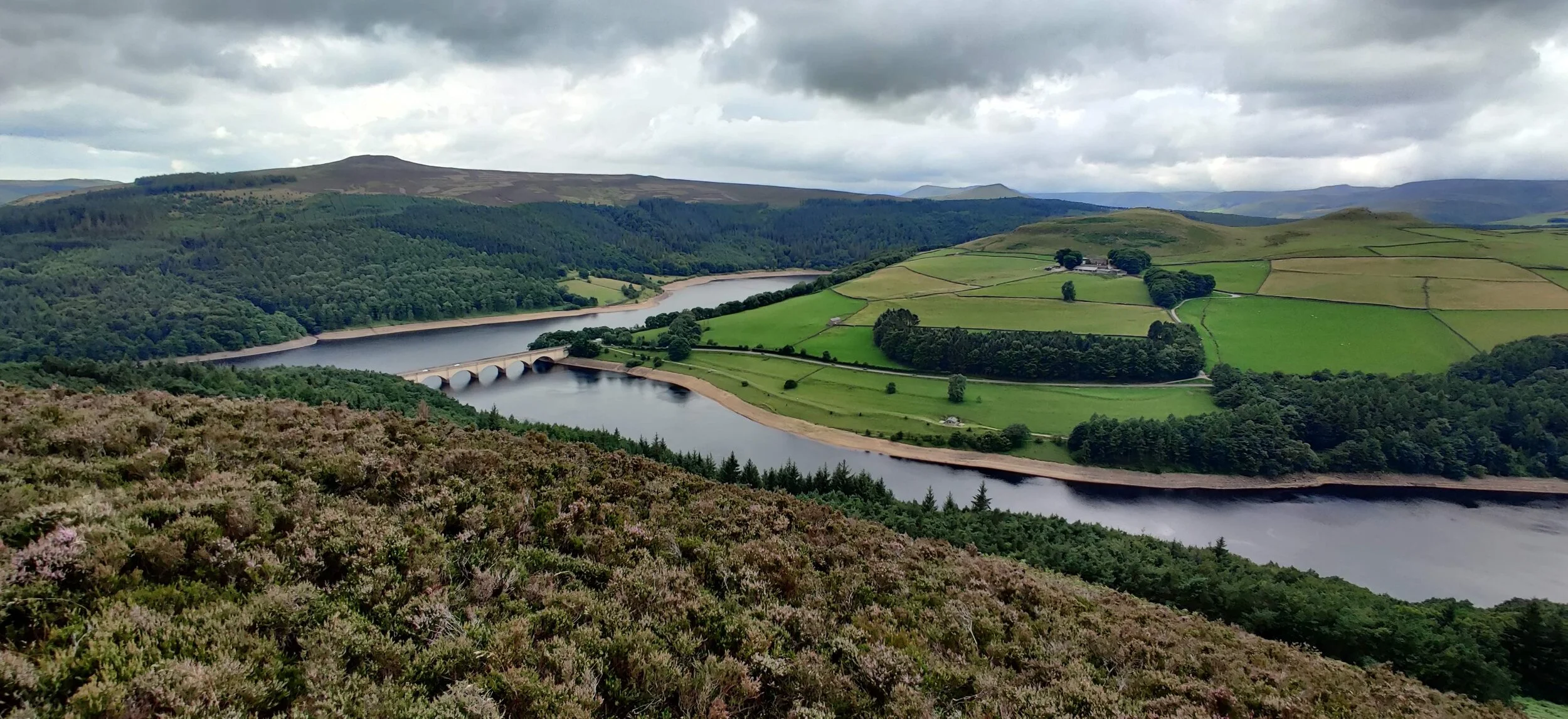 We eventually got to a point where 5 paths meet. Just beyond is a great viewing point. Proving quite popular as from here, you have great views of Ashopton Viaduct. A very photogenic bridge, where the Snake Road (A57) crosses Ladybower reservoir. The full length of the Derwent is also visible.